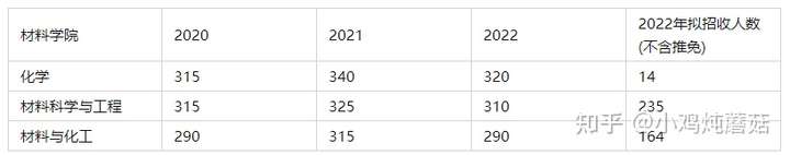如上表所示,材料学院共分为三个专业,化学专业、材料科学与工程专业(学硕)、材料与化工专业(专硕),化学专业的分数最高,其次是学硕,专硕。表中最后一列为2022年拟招收人数(不含推免),可以看到北化的材料专业招收名额还是比较多的,近几年三个专业加起来,除去推免人数大约在400左右,相对来说还是比较好考的。
