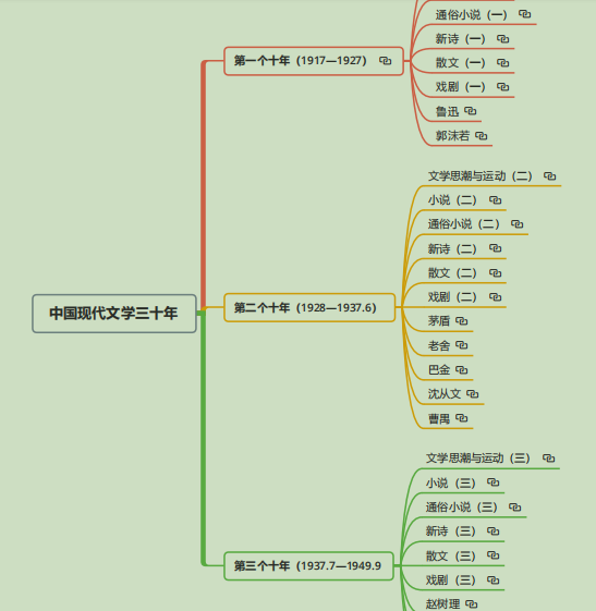 (《现代文学三十年》和《当代文学》按照时间顺序理清文学演进脉络,大的时间节点一定要记清楚,外国文学也一样,比如欧美文学按时间顺序整理:中世纪文学(代表作品但丁《神曲》)----文艺复兴时期文学(代表作品塞万提斯《堂吉诃德》等)----古典主义文学----启蒙主义文学----浪漫主义文学----现实主义文学)
