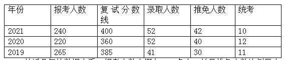 从近几年的数据来看。报考人数大概在200多人,并且推免人数比例巨大,虽然招收50多人(20年扩招一次)但是推免人数达40人左右,统考名额就10人左右。19年复试线为385,20年复试线为360,21年的复试线为400,属于上下波动的情况,主要波动的原因之一为专业课试题的变化,21年考研改过考纲,题目难度有所下降所以大家也不必看到400的线而感到焦虑。
