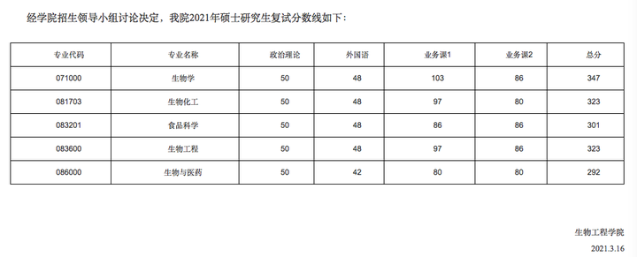 食品科学专业2021年招了14个人,其中7个是推免。可能因为招收人数少,报考人数也不多。出成绩之后,我用过一个非官方排名小程序,一共9个人参与排名,当时我排第二,因为是非官方,肯定比报考的人少,官方排名出来后,我排第3,所以我推测大概就十几个人报考。除2020年食品科学专业的复试分数线为333分外,近几年的复试分数线都在300分左右。