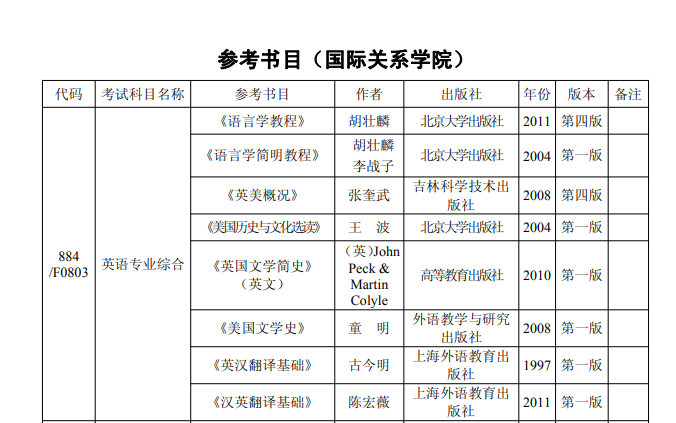 英语专业综合:上面表格里是他的参考书,考察的主要内容.翻译(汉译英和英译汉)、英美概况(多选和判断)、英美文学(填空/术语解释/问答)、普通语言学(多选/术语解释/简答/论述)语言学胡壮麟的语言学教程重点前六章,还有语言学练习册。十分不错,后面的中英文双语的,对靠英译汉很实用。结合真题把真题常考的知识点给背会。词汇我是买了一本现代英语词汇学概论。语言学有点难理解,所以要多背。对于平时我认为应该多看一些文章。文学,我是买了上述的书单,先把书看了一遍,把他们的流派都给弄清楚,把他们的时代思想结合时代搞清楚,文学选读是看的杨启深的英国文学选读和美国文学选读,也在网站上听了一些课,我花了一些重点的作家作品,自己结合环球整理了答题的模版。