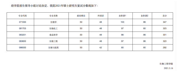 食品科学专业2021年招了14个人,其中7个是推免。可能因为招收人数少,报考人数也不多。出成绩之后,我用过一个非官方排名小程序,一共9个人参与排名,当时我排第二,因为是非官方,肯定比报考的人少,官方排名出来后,我排第3,所以我推测大概就十几个人报考。除2020年食品科学专业的复试分数线为333分外,近几年的复试分数线都在300分左右。