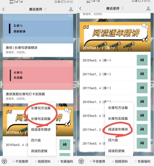 唐迟老师的课很多,但个人感觉非常有价值的课是“长难句方法论”、“长难句实践篇”、“阅读逐年精讲”。这些在唐迟老师微信公众号都能找到(见下面的截图)。其中,“长难句方法论”、“长难句实践篇”可能会更适合有一些语法基础的同学去听,课时很少,但都是精华,听的时候认认真真记好笔记,后期可以反复体会。另外,“阅读逐年精讲”讲的是2010年与2011年四篇阅读,这些视频里讲解的内容可以说是涵盖了所有的阅读技巧,听的时候更要认真记好笔记,后期做题的时候反复看。这些课程短小简练,第一遍听的时候可能还有很多不理解的地方,这很正常,后期可以再听第二遍、第三遍……每听一次后会有新体会。我当时是在做第一遍真题前认真听了一遍,后期做真题的时候又听了一遍。