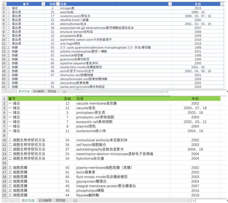 书过完了以后就开始梳理真题,利用真题找报考学校考试的重点。我是利用excel表格进行梳理(见下图),名词解释,英汉互译,简单题,论述题都按章把它们梳理在一起,这样重点就很明确,有的章节每年都会出题,有的章节十几年都没有考过,哪些知识点经常考,以什么题型考,都能在梳理好的excel表格上直观的体现出来。