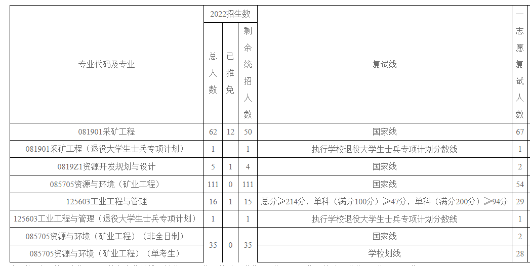 这是今年能源与矿业学院的复试线,大家可以很清晰的看到只要你过了国家线,就一定会有学上,历年的国家线就是该专业的复试线。北矿的矿业工程专硕一直以来都是招不满的,需要大量调剂名额。