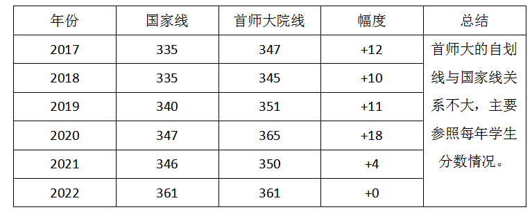 2022年,艺术学国家线从2021年的346上涨15分到361分,首师大音乐学院的院线与国家线持平。
