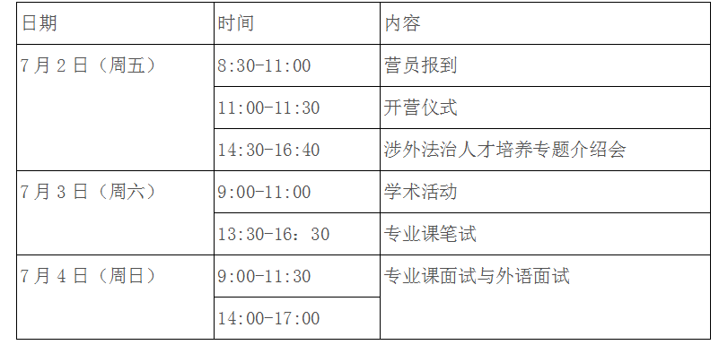 中国政法大学国际法学院的夏令营一般在每年六月中上旬,大家需要时刻关注官方网站的通知。官方网站http://gjfxy.cupl.edu.cn。以下为去年夏令营的时间安排。