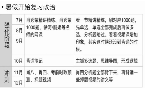 真的不用开太早,专业课允许的话就7月开,不允许也可以8月开,都没关系的。1000题最好做一做,但是没做完也不需要自责,起码做完马原史纲。视频课从强化班听就可以,选择自己喜欢的老师(比较出名的是徐涛老师和腿姐),徐涛老师强化班尤其是马原比较出名,腿姐技巧班强推!所以我觉得听完徐涛老师的马原之后可以剩下的听腿姐的,腿姐的上课风格也很有意思。最后的冲刺背诵手册也是选择喜欢的老师就可。肖秀荣老师的肖四+加肖8基本是必做的。肖4出版后再开始背大题就行,大家最后大题都差不多,主要是好好练选择题拉开差距。