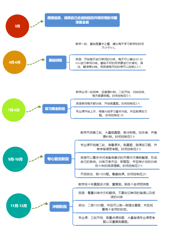 在下定决心考研之后,就要为之列出计划,帮助我们有条不紊的进行。下面是我当时一个大致的时间框架。