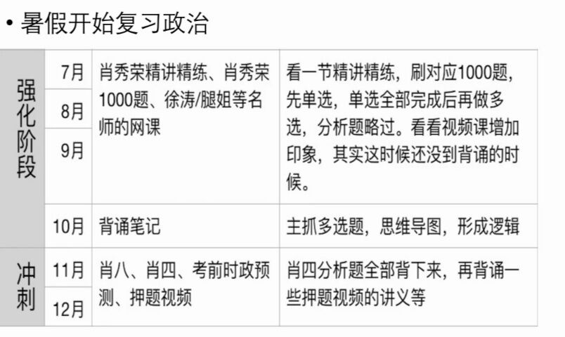 真的不用开太早,专业课允许的话就7月开,不允许也可以8月开,都没关系的。1000题最好做一做,但是没做完也不需要自责,起码做完马原史纲。视频课从强化班听就可以,选择自己喜欢的老师(比较出名的是徐涛老师和腿姐),徐涛老师强化班尤其是马原比较出名,腿姐技巧班强推!所以我觉得听完徐涛老师的马原之后可以剩下的听腿姐的,腿姐的上课风格也很有意思。最后的冲刺背诵手册也是选择喜欢的老师就可。肖秀荣老师的肖四+加肖8基本是必做的。肖4出版后再开始背大题就行,大家最后大题都差不多,主要是好好练选择题拉开差距。