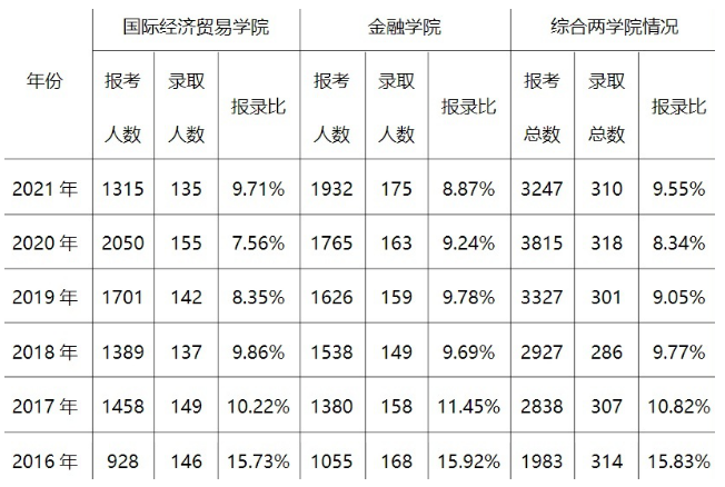 近年来贸大的录取数据情况如下,虽然贸大每年录取的人数较多,但是报的人也很多,报录比不容乐观。