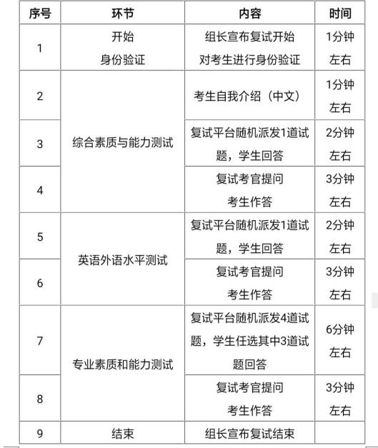 由于疫情原因,我是在家线上复试的。线上复试包括外语水平测试(口译、听力)、专业素质面试、综合素质面试等,具体流程见下图。该校的初、复试各占50%,所以复试也很重要,我听说过很多初试分数不错,而复试被刷的。