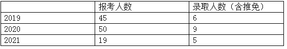 由于是理科,本专业统考名额一直不是很多,但是每年报考的人不是很多,报考难度相比于材料院其它专业,要低很多。本来我们专业加推免今年一共计划招十个,但是由于复试线就是理科国家线,最终统考招了五人,其中第五名最终成绩为491.6,初试309。下面是19-21年的报考人数以及录取人数。