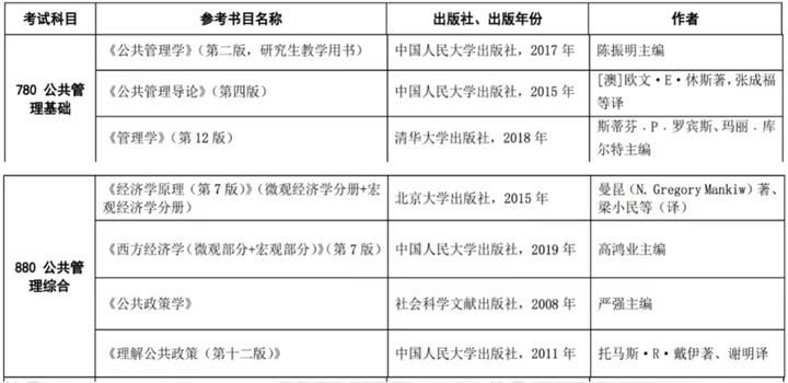 其次,参照22年招生简章中所给参考书目可知,780的参考书目有《公共管理学》(第二版,陈振明主编,中国人民大学出版社,2017年)、《公共管理导论》(第四版,欧文·E·修斯著,张成福译,中国人民大学出版社,2015年)、《管理学》(第12版,斯蒂芬·P·罗宾斯主编,清华大学出版社,2018年);880参考书有《经济学原理(第7版)》微观+宏观经济学分册(曼昆著,梁小民译,北京大学出版社,2015年)、《西方经济学(微观+宏观部分)》(第7版,高鸿业主编,中国人民大学出版社,2019年)、《公共政策学》(严强主编,社会科学文献出版社,2008年)、《理解公共政策(第十二版)》(托马斯·R·戴伊著,谢明译,中国人民大学出版社,2011年)。其中《公共管理导论》和《理解公共政策》的重要程度比起其他书来说不是特别重要的考察重点,所以复习的时候要将重心放在其他7本书上!这里在学习的时候除了看原版书以外,还推荐圣才的考研笔记。