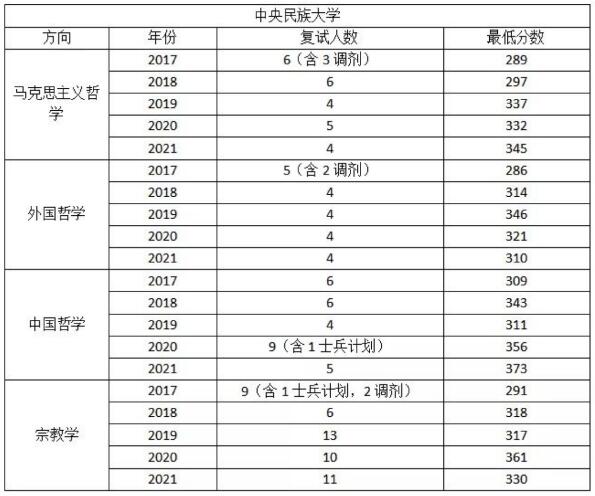 中央民族大学哲学与宗教学学院目前学院有有2个本科专业(哲学、宗教学)、4个硕士点(马克主义哲学、中国哲学、外国哲学、宗教学)、3个博士点(马克思主义哲学、中国哲学、宗教学)。硕士研究生初试考试所有专业都考611中国哲学史和811西方哲学史。而复试考察具体的学习专业。由于宗教学专业是学科建设重点,所以招生人数比起其他多一些,维持在十个左右。不存在本科歧视的情况,并且保护一志愿。对英语四六级也没有要求,主要是以初试成绩为主,综合考察学生的能力,所以对于本科院校没有那么好的我来说比较温和善良。参考近年来复试线的变化,波动较大,这也意味着,考研人数的逐年增加,提升了考研成功的难度和不确定性。争取考到更高的成绩,才能使自己处于优势地位。这也意味着扎实的基础,全面的学习计划对于考研学子的重要性。但是民大的考纲比较详细,而且出题规范,难偏题怪题不多,所以也意味着在学习过程中进行全面的有效的掌握,有助于考试取得更好的成绩。