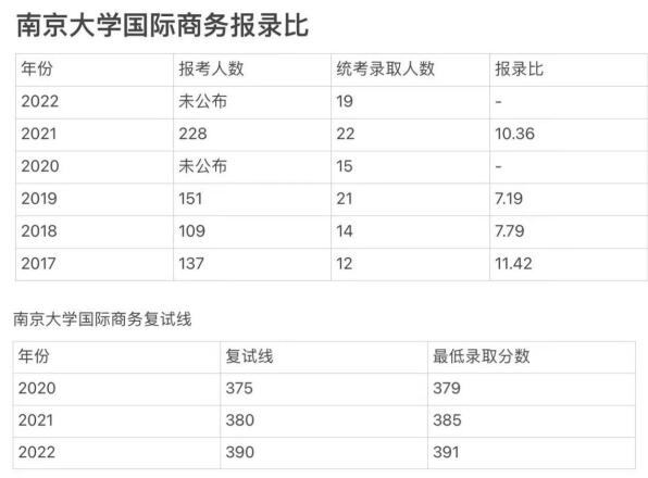 作为想要报考南京大学国际商务的考生来说,清楚地了解该专业的报录比、往年分数线、考试科目是必要的。下面是学姐整理的往年数据: