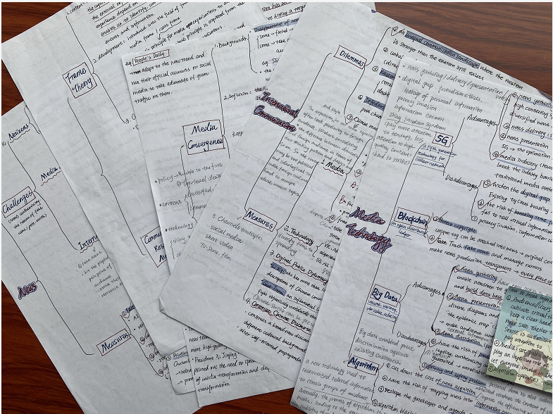 8月:八月份时我就结合来挺的三件套进行第二遍的阅读,但这一遍我是边看边整理名词解释,在LT笔记的基础上再添加自己的一些想法或者结合当下的热点增添亮点。其实名词解释的考察范围就是在这三本官方参考书里,外新史考察得较少,另外两本就比较多。基础理论的整理就是按照书上的逻辑来,提出者、概念、基本内容、发展、作用影响等,一般250-400个字就足够啦~而前沿理论例如如说元宇宙,直播带货呀之类的,我们也同样可以套用,提出背景,目的,内容,要点,意义等等,但这些都需要自己去查资料看论文才能整理出来哦。另外从八月份开始我们就要去看论文进行专题整理,我大概是每周整理一个专题,国传的内容比较多就花了两周,整理出来一共八个专题(经典理论、媒介融合、直播、技术、互联网治理、短视频、新闻理论以及国际传播)。整理专题的过程中要注意案例、答题语料以及名言的积累哦~
