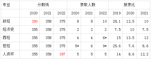 从表中看,901每个专业所录取的人数都很低,所以分数线、报录比波动都非常大,2020年政经单独划线到达了380分,但同时世经却存在校内调剂的名额,2021年专业课难度提升,没有单独划线,也不存在校内调剂,2022年人资环又单独划线,但同时西经和世经又存在校内调剂名额,这里虽然只列出了近三年的数据,但是纵观往年所有数据,由于招生人数少,数据波动很大,很难有一个稳定的规律,但仔细观察还是能发现几个潜藏的规律,一是每个专业存在着不太明显的大小年,学经济的的,都对博弈论有所了解,并且会认为别人是理性经济人,但实际上在这个决策过程中,大家都不是特别理性,所以导致数据告诉我们,这个每个专业考取难度存在大小年的现象是客观存在的;二就是政经作为川大901的王牌,考研难度相对最大,而经济思想史这个专业懂的都懂,难度相对最小。