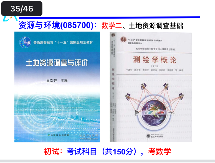 重点内容在第一章,第四章,第五章,第七章。因为这个专业偏向土管,所以近年复试很多同学抽到土地资源管理的相关问题,这个在初试中也涉及到了,所以初试也算是在给复试打基础,如果不会也要硬着头皮答。