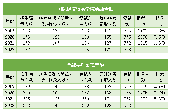贸大金融专硕分两个学院进行招生,金融学院和国际经济贸易学院,两个学院初试内容一模一样,复试统一划线,但复试内容略有区别,金融学院侧重考察专业英语,国贸学院侧重考察日常口语对话。近几年两个学院的录取情况如下: