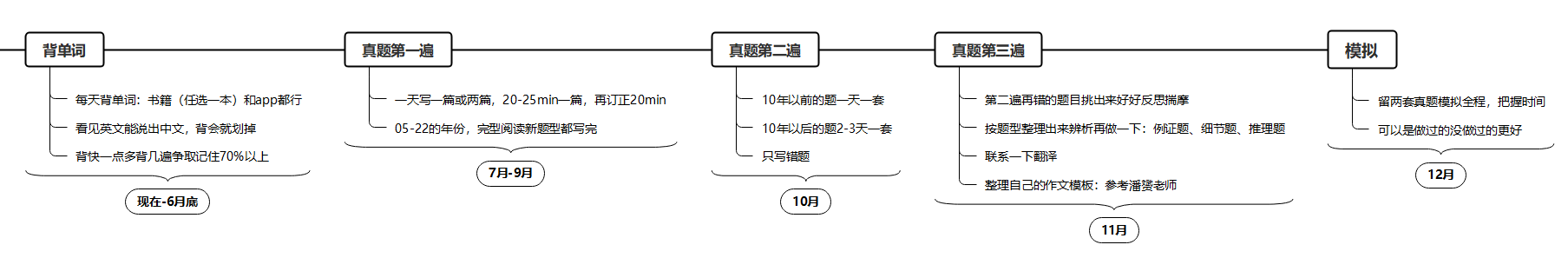 十一月是第三轮真题,还错的就要挑出来好好反思(还会错的),按题型分析总结每种题型的技巧,总结自己的作文模板顺便练习翻译。