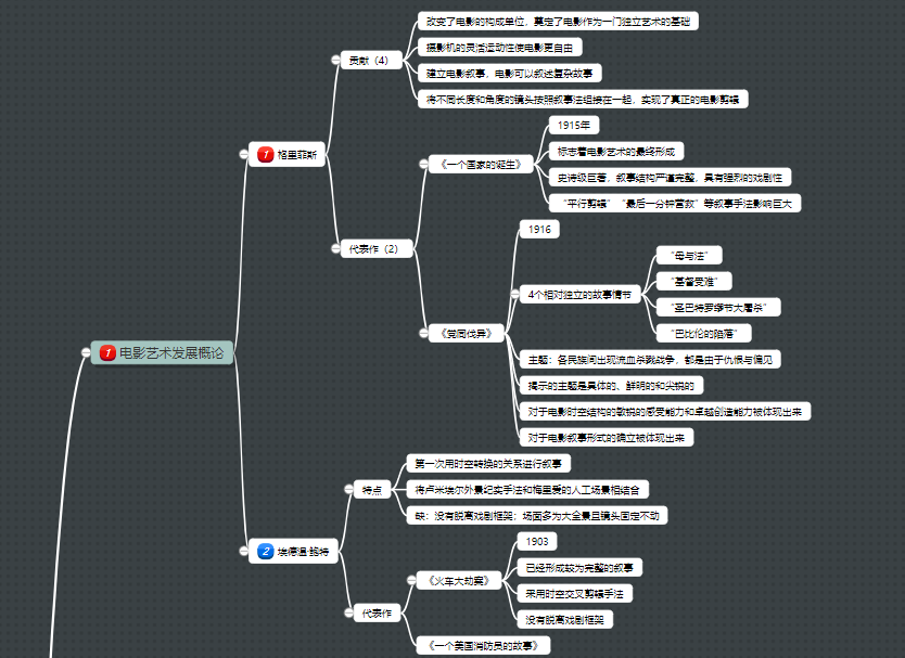 在7-10月第二阶段,于7月初参加了为期十天的线下集训课,主要内容是对书本的详解与答疑。因为在第一阶段已经粗读过参考书两遍以上,对参考书比较熟悉,所以在课上能够更加轻松的跟上课程,并且能够带着问题去找答案,提高了学习效率,在此课程之后便开始深度复习与整理专业课内容。对中国电影史、外国电影史、中外广播电视史、广播电视文艺学等重要内容进行了思维导图式的整理,对每个章节中的关键人物、代表影片、流派特点等内容进行细致划分,采用关键词、关键句的方式记录以便背诵和记忆(如下图)。第二阶段每天在专业课上的用时在4-5小时左右。