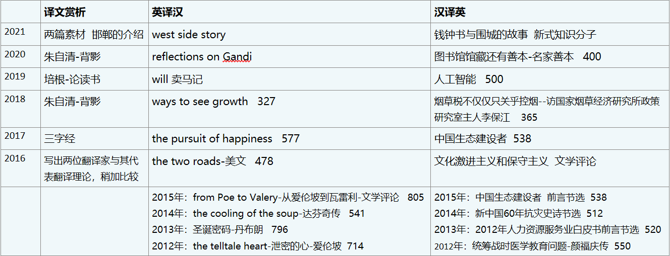 首先在第一年的备考中我的文学翻译打好了还算可以的基础,因为上外的学硕考题风格就是散文翻译,我阅读完了《张培基散文选》的三本,并将第一本中挑了几篇文章自己练习。在阅读张老的作品中积累了各类妙词妙句摘抄下来,这样就获得了一个自己的memory bank。最大的收获是我认识到了要形成自己的翻译风格,对篇章、段落再到句子和选词的处理构成一整个连贯成熟的翻译过程。翻译是一门技术,也是一门艺术,处理文学翻译前我们要培养自己的文学素养,学会批判性思考,对任何事物要有自己的观点,还要擅长观察生活细节,要有调动自己的知识库去描绘出眼中的美的能力,这样在翻译文学作品的时候,我们不再是搬运工,而是再创作的过程。翻译带来的成就感会带来源源不断的动力让自己坚持下去。非文学翻译的学习我主要是围绕着政府工作报告展开的,去年我是先开始了catti三笔的备考,每天坚持积累政经的词条和选择题的错题,并在下一天温习,考试中注意不讲究句式选词的华丽,做到简朴严谨即可。此外我还阅读了《中式英语之鉴》,这本书可以算是翻译必看之书,很巧的是我在高中就买来了,这次考研备考中才认真读进去了,可以说从细枝末节中纠正自己的翻译错误,形成了好习惯。