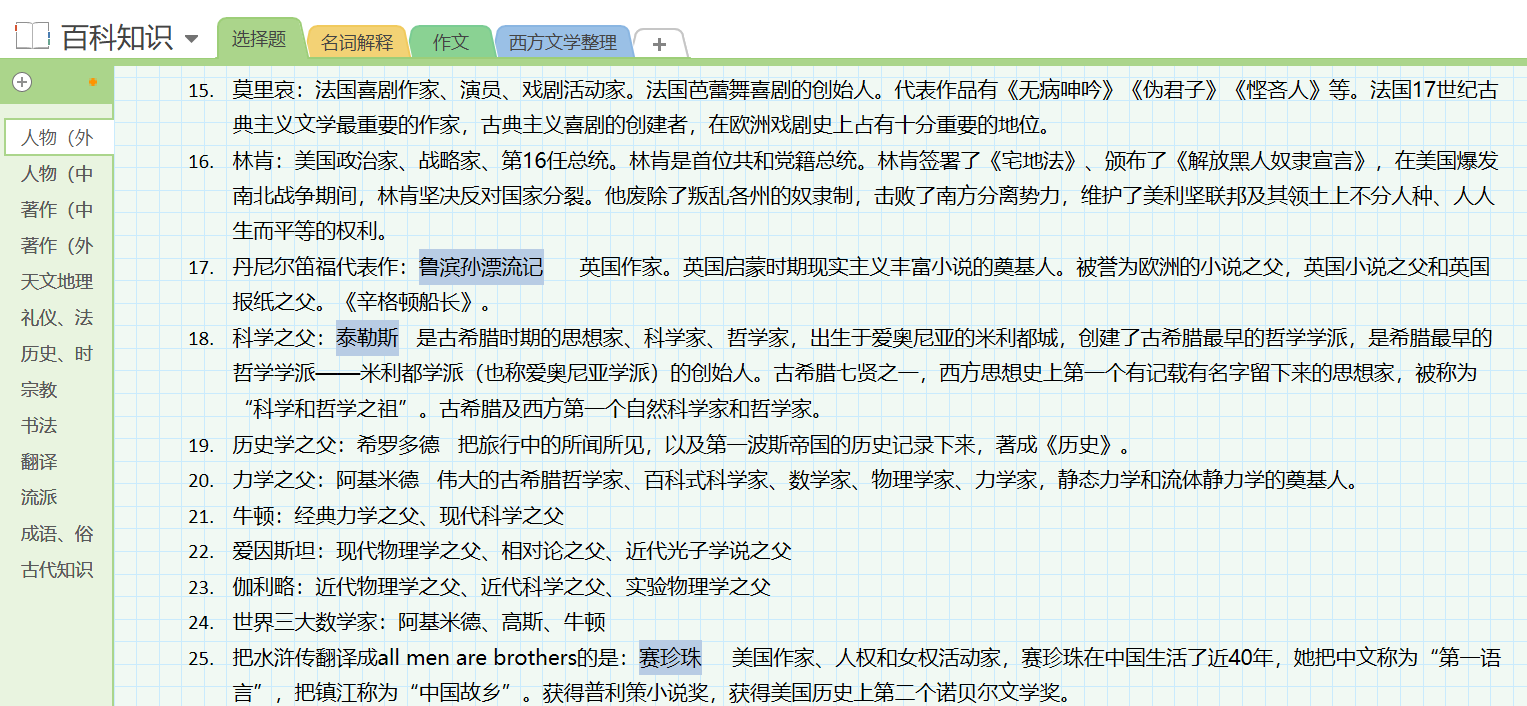 百科,百科知识这门课我是毫无基础的,刚开始是一个头两个大,在浏览过众多经验贴后,我摸索出了适合自己的节奏,首先购买了mti黄皮书,为了在三个月内迅速建起这个庞大的知识树,我还阅读了林青松的《应试指南》,刘军平的《汉语写作与百科知识》。第一步我收集了往年真题全部把答案写上然后建立一个电子笔记本,按照不同主题分类整理好并把答案做出标记。大家如果在考研复习过程中有困难的话,也不妨报一个辅导班,比如新祥旭考研全科一对一私人订制VIP辅导课程,针对性强,上课时间可以灵活协商,课下还可以免费答疑解惑,对考研初复试应试备考这块的帮助是非常明显的。