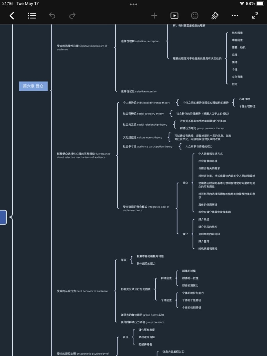 专业课:334新闻实务估计这是所有备考上外新传的人最怕的一门了(我自己也是),因为它是全英考卷。但过来人想说,全英只是一个门槛,考察的内容和英语还是不难的,是基础的。我的备考建议有以下几点:传播学理论的打底书籍(中英版)要好好看,几个月的备考过程中一直看反复看,自己要整理思维导图(如下图所示,我自己整理的知识点框架图),记住不同知识点的英语表达。有几本书推荐给大家(不在考纲里但非常有作用):《传播学核心理论与概念》,《新祥旭辅导班专业课讲义》里面按照逻辑梳理了全部传播学知识点,中英对应非常有用;《新闻传播学专业英语教程(第二版)》,中英对应,也很适合打底。学到11月,大家配合其他书基本上对传播学知识点有所掌握,脑中对知识的中英理解就可以应付简答题了(如果没背过英文的话,就按你对其中文的理解进行简单翻译)。
