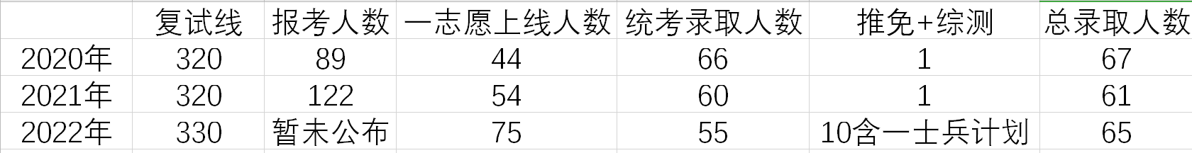 材料与化工是2020年才开设的专业硕士学位,因此考研难度不大,总体来讲,20年、21年因为一志愿上线人数小于计划录取人数,一志愿只要过线320就能录取,复试没有一人被刷,并且缺额的调剂也都是从学硕化学工程与技术调剂过来的,不接受校外调剂,可见中南大学十分保护一志愿。22年考研人数大涨,中南大学材料与化工专硕复试线也从21年的320涨到330,一志愿330复试线进入复试75个,统考录取55个,相比于20、21年肯定上岸难度增加了,但是对于23考研可能是个机会,因为因此可能会劝退一部分人,报考人数也可能会变少,复试线也可能再降低。中南大学化学化工学院材料与化工近三年报录情况见下表: