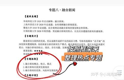 10月:在十月的时候,大家的新闻传播基本知识应该已经背了2轮以上了,实务和答题也练习不少了。这时候可以开始进行一些热点专题的积累。就比如5G、区块链、媒介融合、算法这些热点专题,大家可以按照名词解释-特征-应用现状-存在问题-解决措施-发展趋势等逻辑来进行专题的积累。