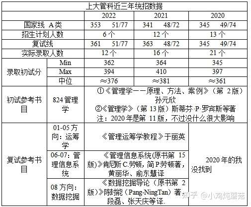 2、择校(地区→学校)。在确定跨考管理学之后,也是在一些经验贴上了解到经管类的选择经济比较发达的地区会比较好,因为企业会更多也更好,有利于找研究的案例和实习就业的平台,而一些实验需要用到昂贵仪器设备的专业就可能需要优先考虑好的学校或学校该专业在全国的排名,毕竟相对来说,这类学校拥有的资源会更多,有利于做研究。所以我优先考虑的是北上广深,由于气候原因,本人更适应南方,优先考虑的是广州和深圳,离家也近一些,然后去研招网上找了这两个城市中开设该专业的院校,中山和华理我直接放弃(我真的很有自知之明),我当时看中了暨南大学和深圳大学,但是去查了下近三年统考招生人数和录取数据(各院校录取数据很多公众号上面都有,比如董良才考研规划),实际录取人数基本上是个位数,而且录取的分数也不低,溜了溜了。于是我把目光放在了上海,我对比了上大、东华和上海理工大学,上大东华都是 211,管科学科评估是 B,上大最终录取人数比东华多一点,而且大致的录取分数也比东华的低十来分,上理是上海市属重点建设大学,而且本地人好像也比较认可,评价也还不错(?不知道,我看网上说的,学弟学妹感兴趣可以去找本地人问问)管科学科评估是 B+,招的人可以达到四五十多个,但是录取的人分数也不低,20 年和 21 年上理的最低最高录取分数都比上海大学高;同时说实话我可能确实有个名校梦,总想着还是冲一冲 211,虽然很多人都跟我说上海的 211 有多难考, 但是我对比我心仪的几个一线城市的学校往年录取数据发现,上大确实是性价比最高的了;而且当时也听说上海 92 硕士毕业可以直接落户(?忘了要不要积分,
