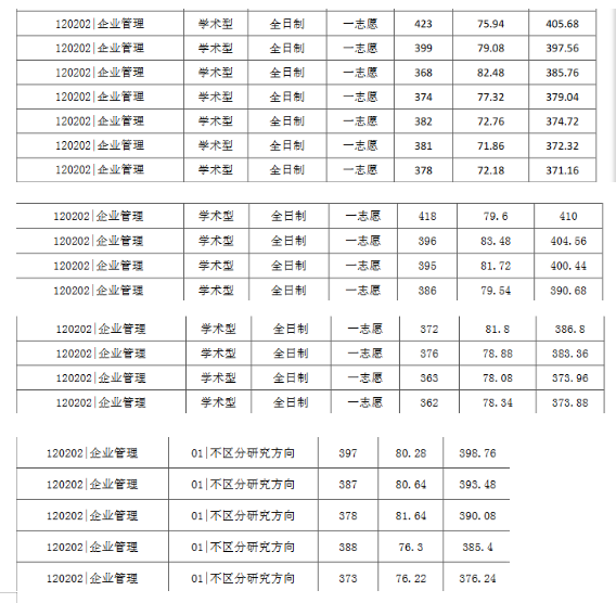 企业管理每年招生5~9人不等,在19年以及以前,每年都是招9个人,20年本来招4个人,最后复试扩招到5个人,相当于等额复试,21年本来招7个人复试扩招到8个人,22年招5个人复试方案出来后是招7个人。所以尤其是综合这三年的情况,我判断23年应该招5~7个人,更可能是7个。以下是这三年的录取人数分数情况(2022、2021、2020),因为19年以及以前是不考统计学的,所以参考价值没有这三年大。