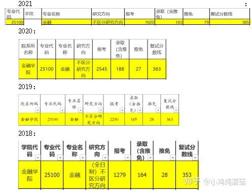 可以看到中南财金专的录取人数很多,每年都有一百多个,虽然报考的人数也很多,但是相比于那些只录十几个,二十几个的专业来说,我觉得更好把握。从往年的分数线来看,大小年的特征其实不是非常明显,18-19年是低、高,20-21年是低、高,对于22考研来说,21年的分数线385着实是挺高的,所以我认为某种程度上一定会吓走一批人,22年的分数线也许会降。这也是一种博弈的过程,你认为22年线会因为21年太高而降,当别人也这么认为时,最终线反而不降,好在22年分数线其实是降了的,是369,而且在最后公布复试名单时比招生简章上还扩招了15名。