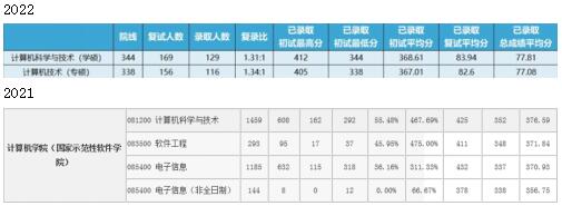 2022年录取最低分是学硕344,专硕338,录取平均分是学硕368.61,专硕367.01。2021年录取最低分学硕352,专硕(电子信息即为计算机科学专硕)337,录取平均分学硕:376,专硕370。但是根据今年的数据来看,只要初试分数可以考到365+,复试基本不会被刷掉。初试才是王道!