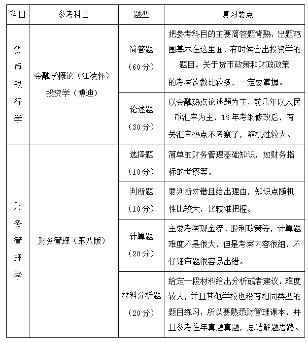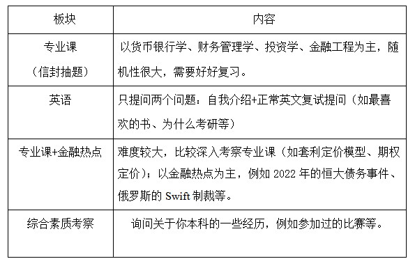 总结:因为疫情现在复试改为线上,以前的复试笔试也取消,所以复试面试的综合难度也相应提高。从考研成绩出来到复试,基本只有一个月的时间可以复习,所以一定要抓紧时间复习。全面复习初试的专业课,因为信封抽题的随机性很大,不然很有可能抽到的三道题目都不会;多关注近期的金融热点,英语自我介绍好好准备,对自己的本科经历要有印象。