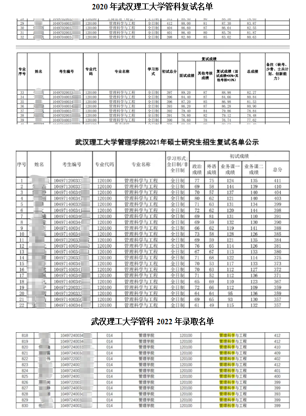 大家可以看到,我们学校的考研分大小年,2020年是大年,2021年是小年,2022年是大年,预测2023年是小年,大部分考生在看到武理2022年的录取名单后,望而却步,选择换学校。所以想报考武汉理工大学管理科学与工程专业的同学,可以抓住今年这个机会。