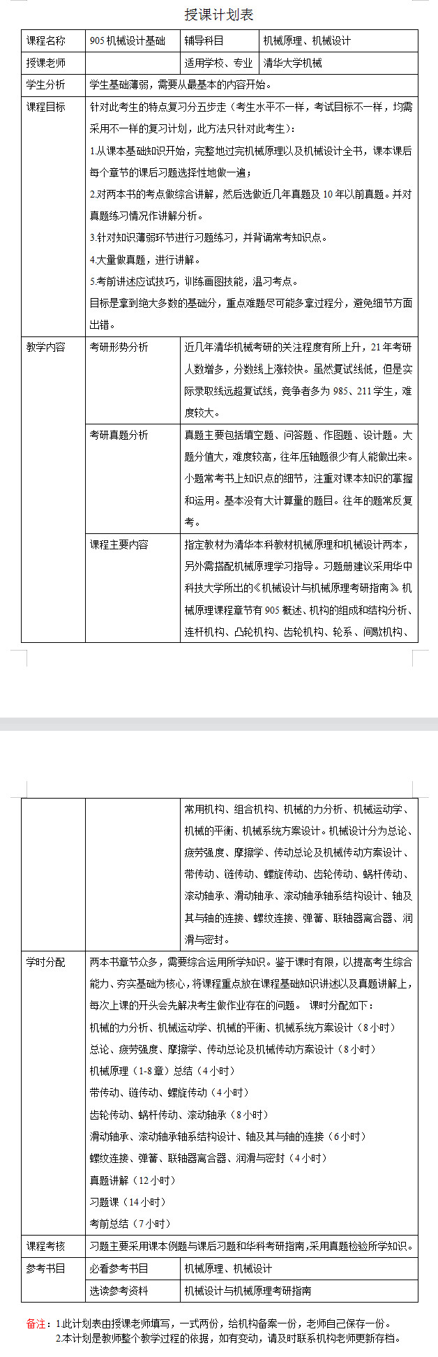 新祥旭考研一对一:2023年清华大学机械工程905机械设计基础考研一对一辅导授课计划