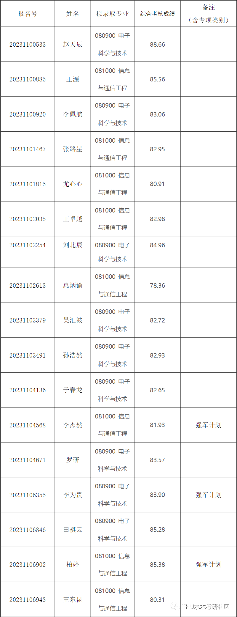 经综合考核和研究生招生工作领导小组讨论,报学校研究生招生工作领导小组批准,清华大学电子工程系2023年接收推荐免试直博生拟录取名单,现已确定,现予以公示