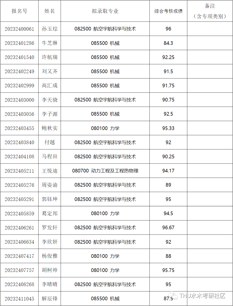 经综合考核和研究生招生工作领导小组讨论,报学校研究生招生工作领导小组批准,清华大学航天航空学院2023年接收推荐免试直硕生拟录取名单,现已确定,现予以公示