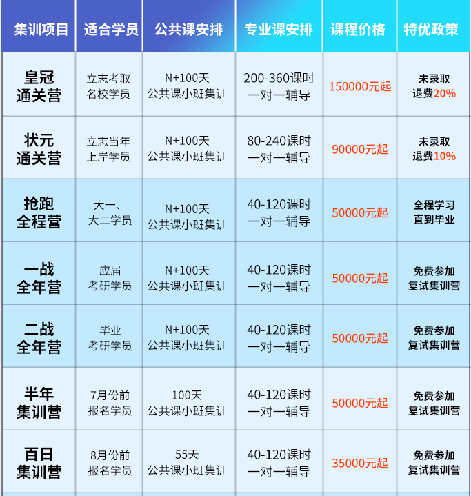 新祥旭考研集训营,专为积极备战考研的学员而准备。每年7月至1月集中开班。政治、英语、数学小班教学,班主任全程督导、课后全程答疑、定期组织摸底考试。封闭式寄宿制全日制管理,吃住学一体化,确保学习环境和学习效果!报名全科一对一皇冠班和全科一对一精英班学员免费赠送特定阶段考研集训营课程。