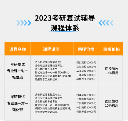 比如您报了我们新祥旭考研的复试辅导课程之后,机构就会为您提供对应的复试服务,只要您认真听课认真练习,效果肯定是显著的。一般比如说英语口语听力方面我们会组织专项训练班课程,为您总结英语口语听力考试时常见的话题、词汇、句式以及应对策略等并进行至少三次专门的模拟演练,提前感受考研复试实战气氛,预防到时候因为心理紧张因素导致的发挥失常,杜绝马失前蹄、功败垂成;专业课方面无论笔试还是综合素质面试均会为您对接报考院校及专业直系的研究生学长或学姐,然后为您一对一量身定做复试准备计划及为您整理相关的复习资料,一对一指导复试所可能考察到的内容,让您有的放矢,事半功倍!具体详见下面新祥旭2023年考研复试课程介绍(下附新祥旭考研复试一对一课程):