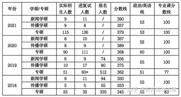 从表格能够清楚的看出,民大专硕招生人数真的呈直线上涨,据我了解到的信息来看,2022年虽然学长姐极力声称不会达到21年的盛况,但确确实实最终招了122个专硕,分数线381分也仅仅比去年涨了两分,但今年的话大家440普遍分数较低,有压分的嫌疑存在。从2020年开始,民大便不再公布报考人数,这就无法准确获知报录比情况,但根据各大科研机构的信息收集,21年报录比大概在1:12左右,22年估计高一些但也不算爆,这个比例在新传专业里面来说其实再正常不过了。