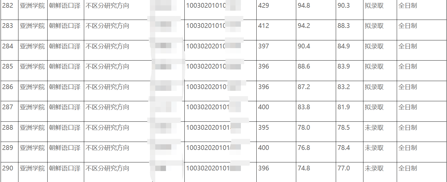 北外的小语种实力真的很强,进三年来,朝鲜语口译复试线每年都往上涨,招生人数也不多。从复试名单上看,北外的专一难度不大,一般给分很高,专二要难一点,可以多花点复试时间在专二,注意北外的初复试占比55开所以复试也要很重视。