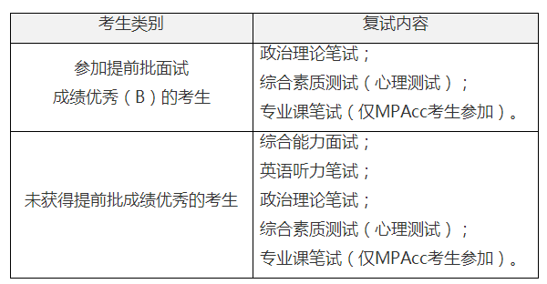 含综合能力面试、英语听力和口语、综合素质测试(心理测试)、政治理论笔试、专业课笔试(仅MPAcc参加)。