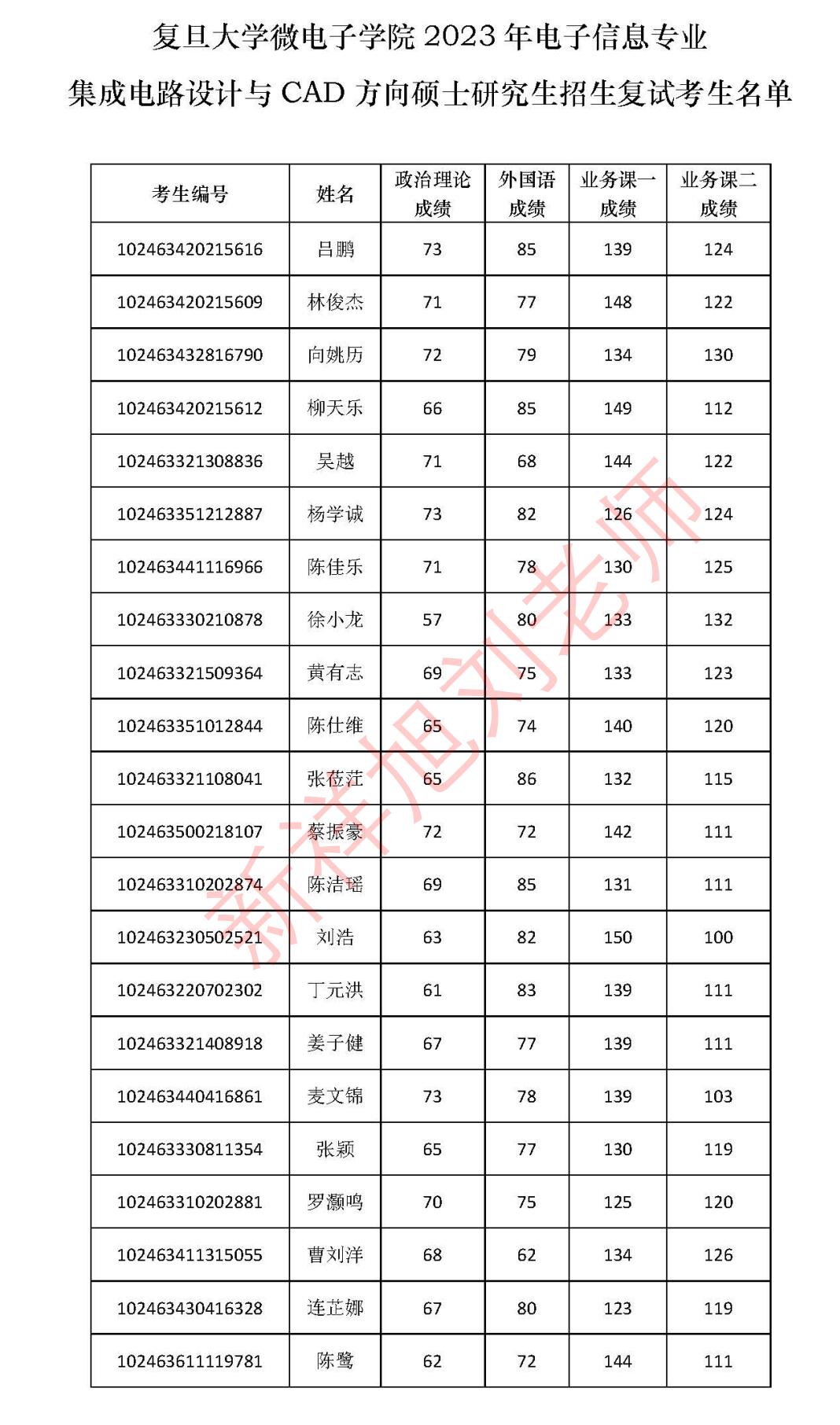 新祥旭考研:2023复旦大学微电子学院电子信息专业集成电路设计与CAD方向硕士研究生复试名单