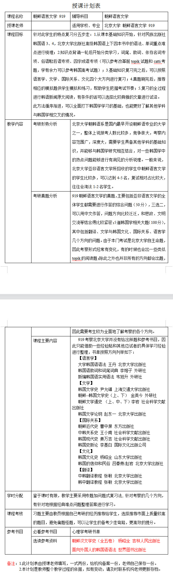 新祥旭考研:2024北京大学朝鲜语言文学919考研一对一授课计划
