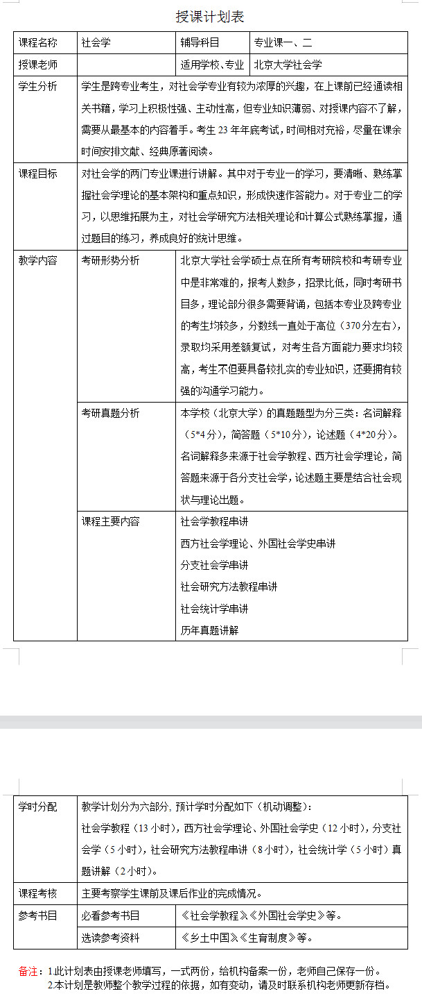 新祥旭考研:2024年北京大学社会学专业考研一对一辅导授课计划