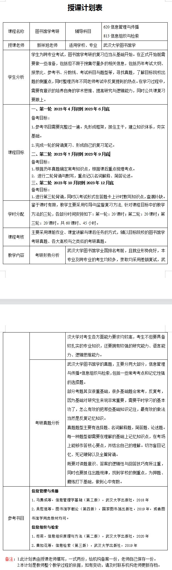 新祥旭考研:2024年武汉大学图书馆学专业考研一对一辅导授课计划