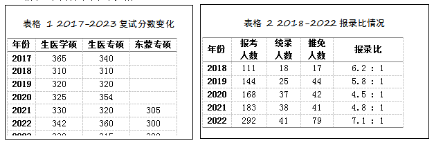 可以看到从报录情况来看,生医学硕的录取人数在近几年都比较稳定,并且隐隐有些上升的趋势。而生医专硕和东蒙专硕的录取人数则有所波动,生医专硕一般只会招个位数,虽然分数低一些,可是机会太少,我一般不会考虑这样的专业。考研难度方面,虽然2022年的报录比达到了7.1,理论上考研难度有所增加,但我认为报录比并不能说明什么,因为报这个专业的有跨专业来的、有一战不努力的(我就是典型)、有被毕设折磨的还有报个名的气氛组,其实真正剩下来好好复习的并没有想象中的多。真正的难度还是要看录取分数的中位数和录取的最低分数。
